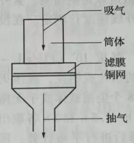 過濾式空氣采樣器是最常用、最簡單的空氣采樣器。過濾式采樣器有采樣頭、濾器、流量計和抽氣泵組成。過濾式采樣器的結(jié)構(gòu)如圖: